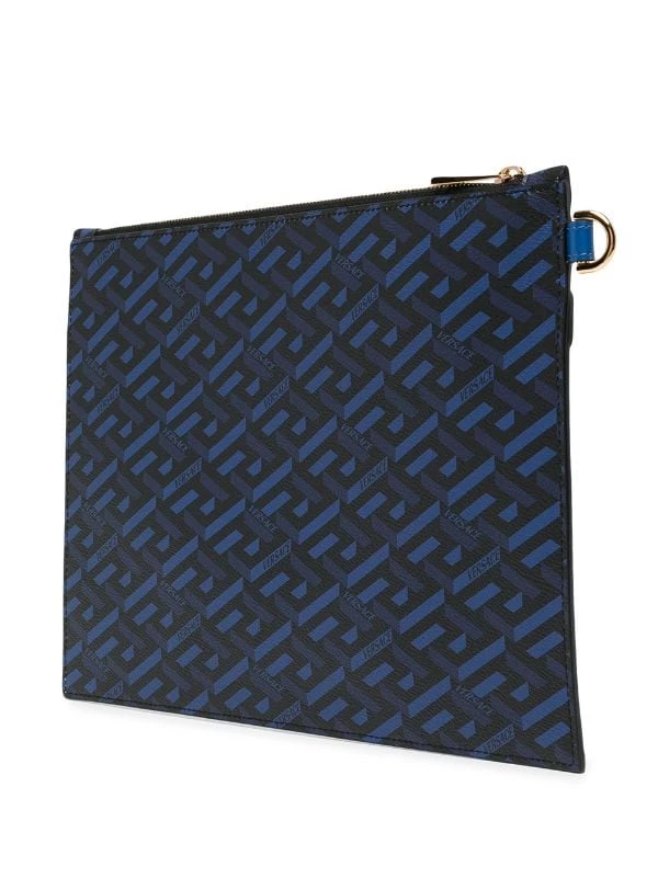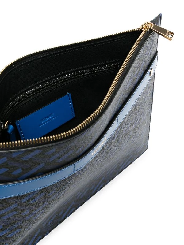 Motif monogrammé, détail Greca signature, bordure contrastante, bride porté poignet, fermeture zippée sur le dessus. Couleur : bleu. Matière : cuir.