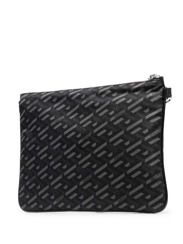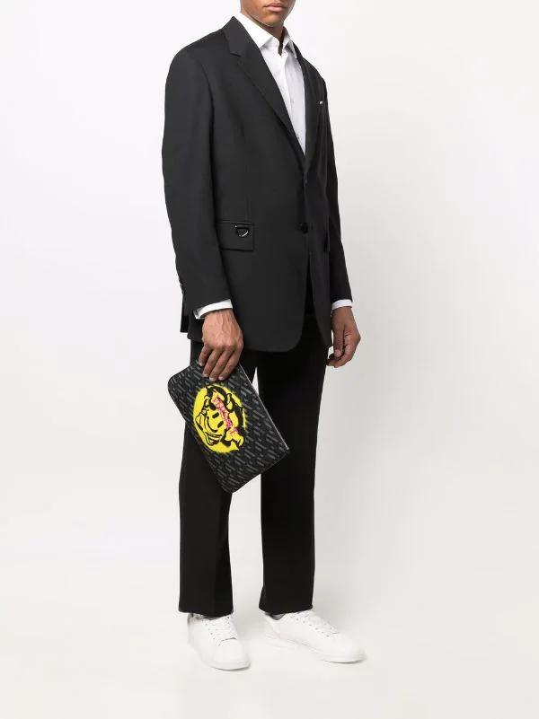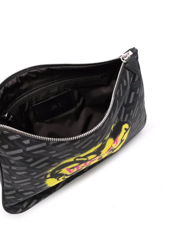 Motif Medusa Smile signature, anse-dragonne détachable, fermeture zippée sur le dessus, patch logo intérieur, poche intérieure zippée. Couleur : noir. Matière : cuir.