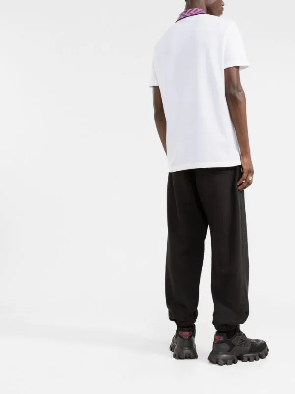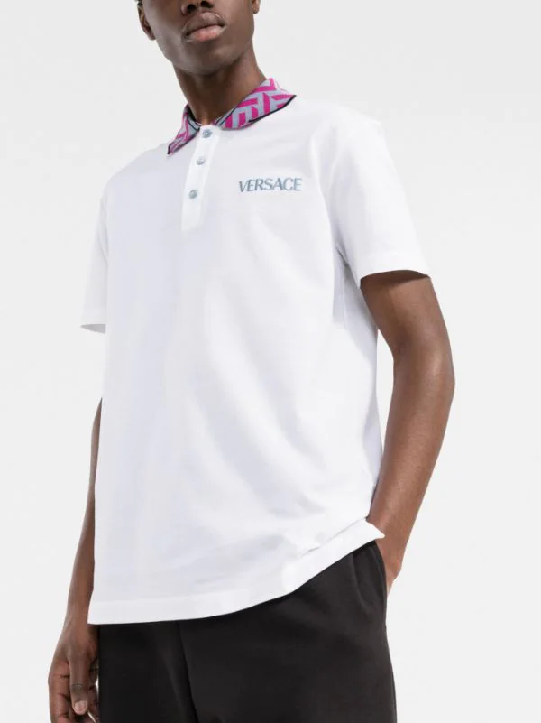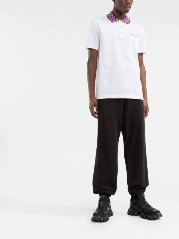 Motif Greca signature imprimé, logo brodé sur la poitrine, col polo, patte de boutonnage sur le devant, manches courtes, poignets nervurés, ourlet droit. Matière : coton.