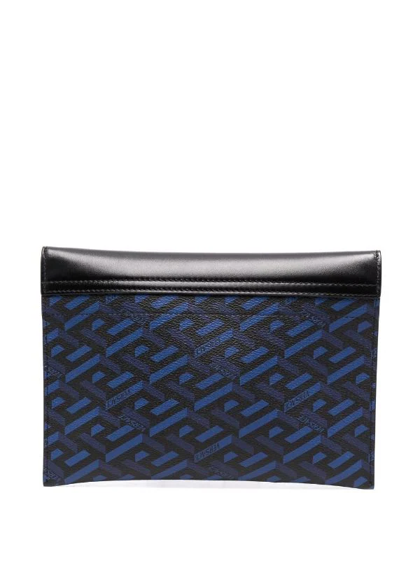 Finitions en métal doré, imprimé La Greca signature, rabat sur le dessus à boutons pression, compartiment principal.