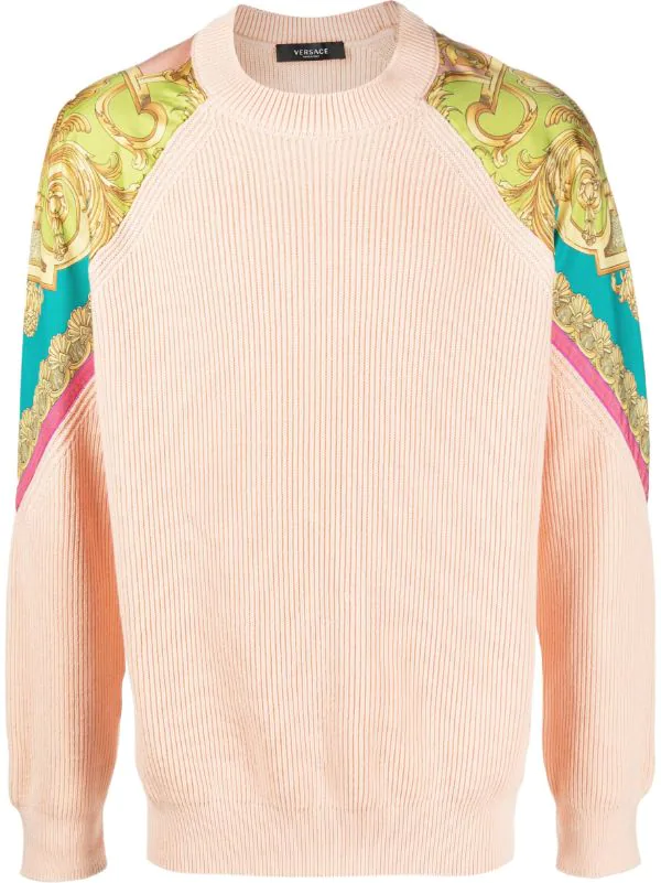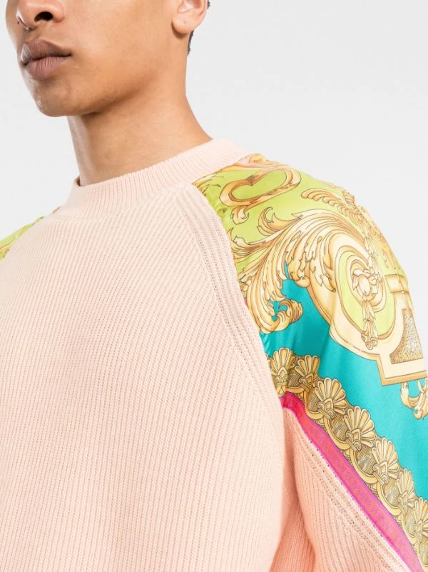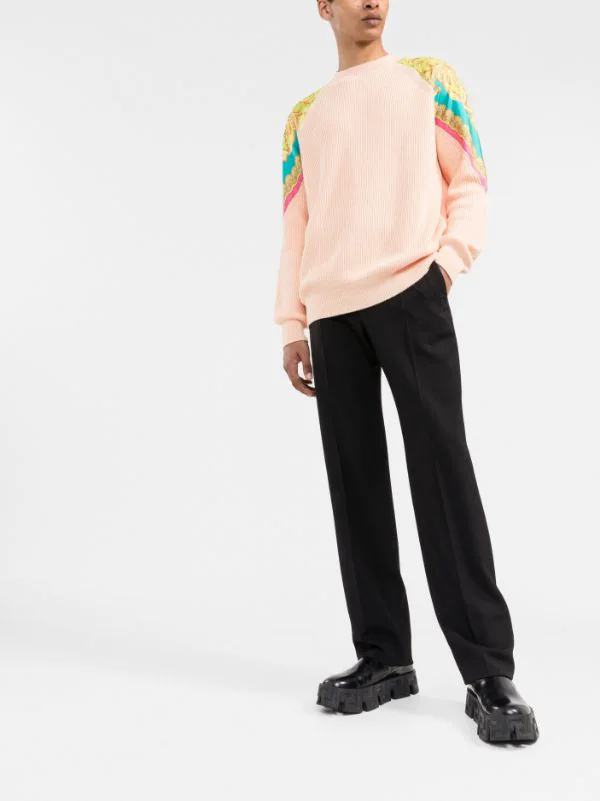 Motif baroque, détail de foulard, détail nervuré, encolure ronde, manches longues, ourlet droit.