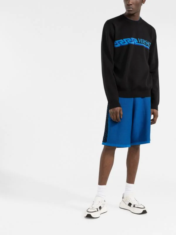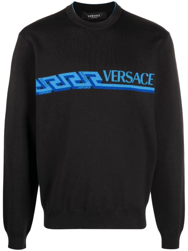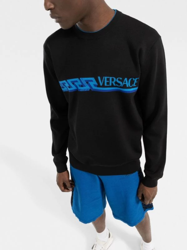 Encolure ras du cou, manches longues, poignets nervurés, ourlet nervuré, logo intarsia, imprimé La Greca signature. Couleur : noir. Matière : laine vierge.
