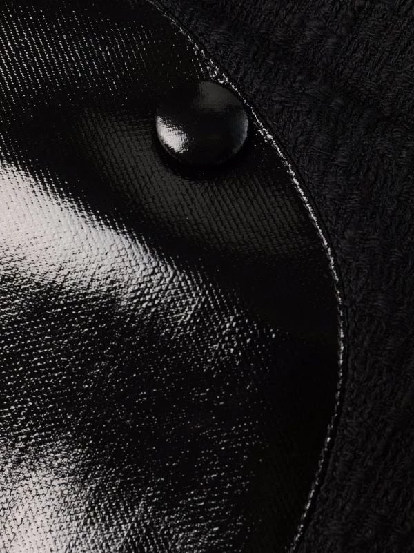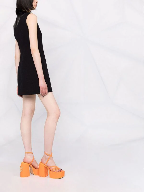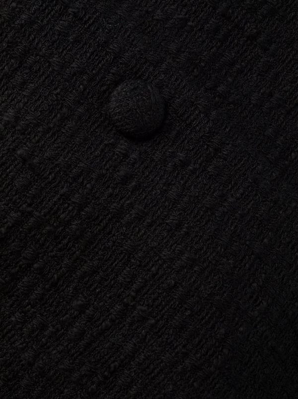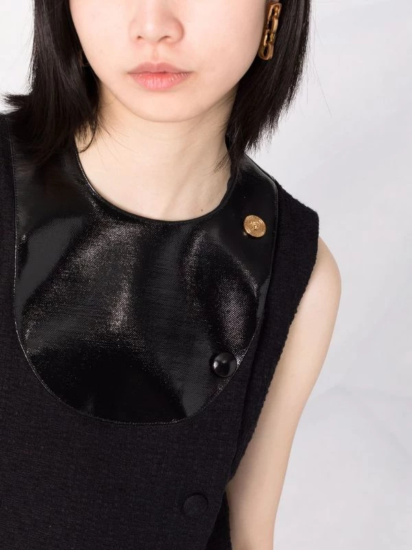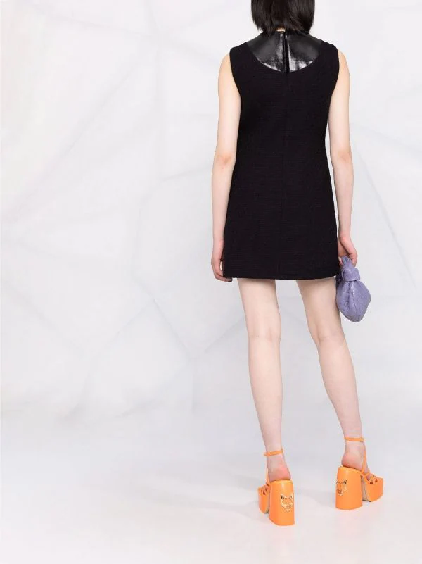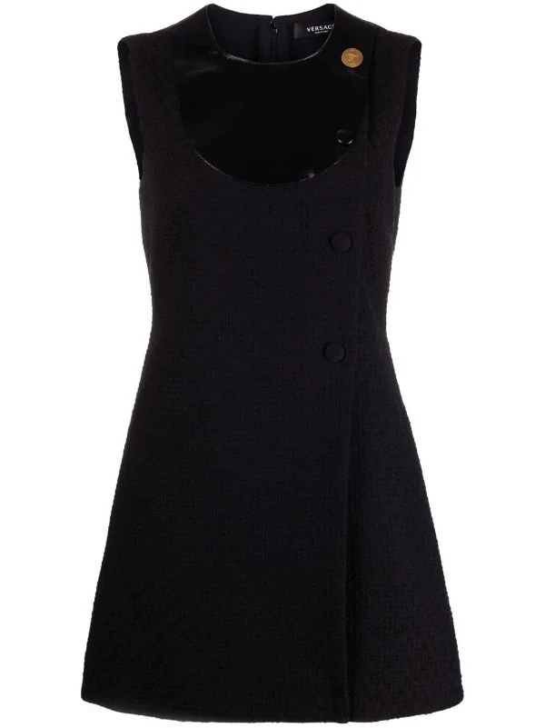 Détail d’empiècement, encolure ras du cou, design sans manches, boutons dorés à détails embossés, détail Medusa, fermeture zippée dissimulée à l’arrière, doublure intégrale, coupe évasée, ourlet droit. Couleur : noir.