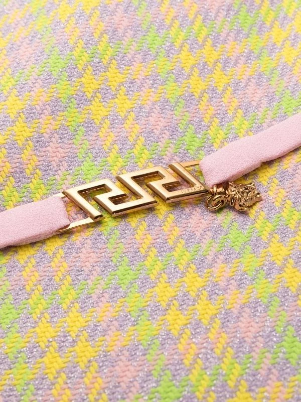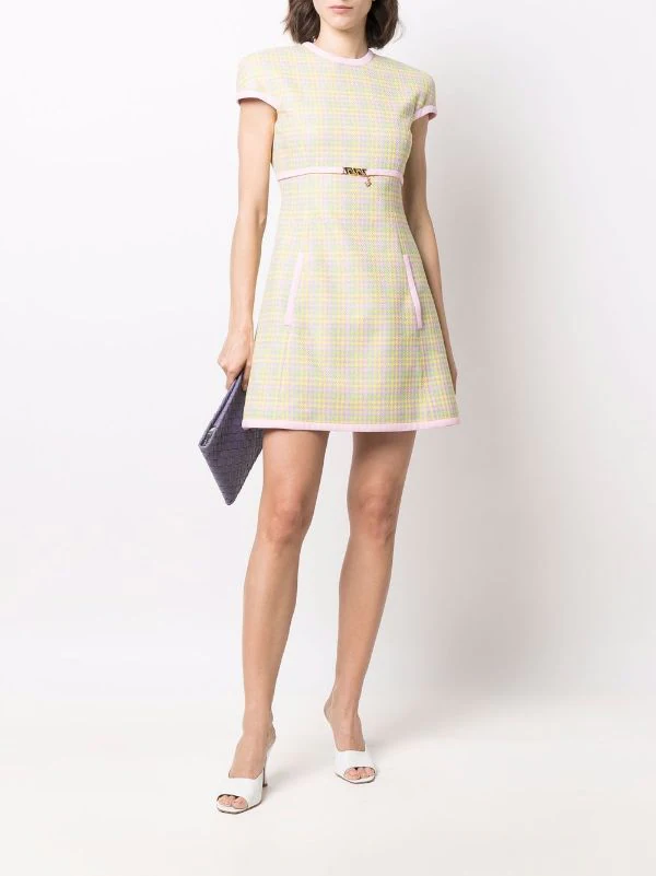 Motif pied-de-poule, détail Greca signature, bordure contrastante, encolure ronde, taille ceinturée, fermeture zippée à l’arrière, manches courtes, poches latérales fendues, coupe évasée, ourlet droit, coupe courte.