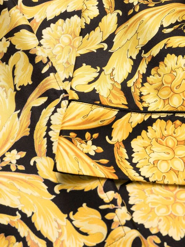 Imprimé Barocco signature, col châle, taille ceinturée, manches longues, ourlet droit, coupe mi-longue. Matière : soie.