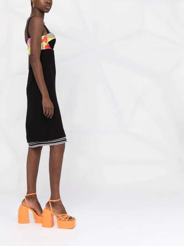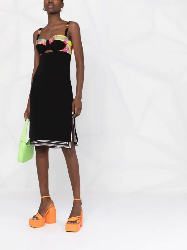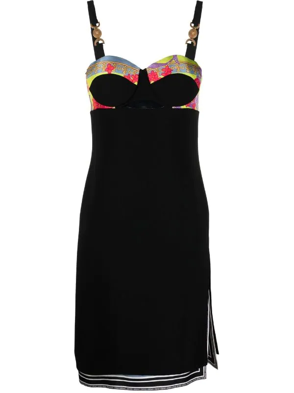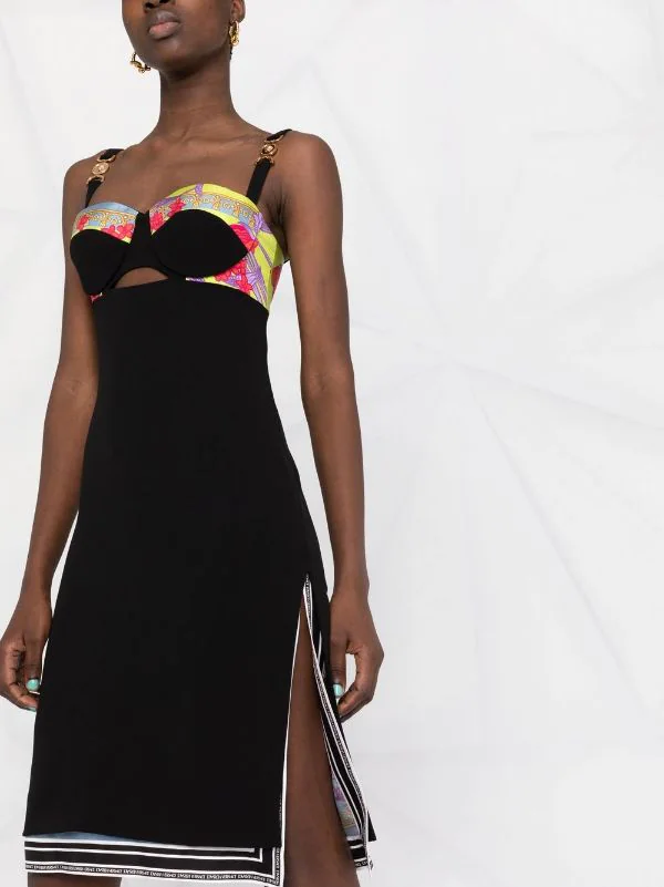 Noir, soie mélangée, détail d’empiècement, détail Medusa, encolure cœur, fermeture zippée à l’arrière, coupe mi-longue.