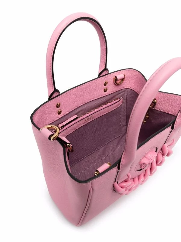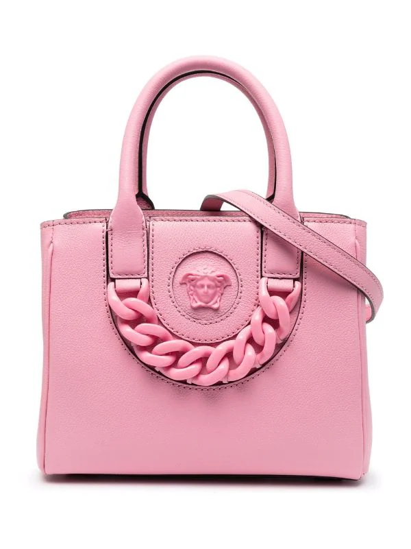 Détails de chaînes, anses arrondies, poches intérieures zippées, bride porté épaule ajustable. Couleur : rose.