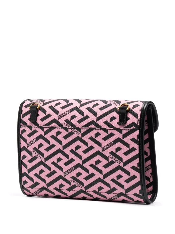 Motif Greca signature imprimé, finitions en métal doré, bordure contrastante, rabat sur le dessus à fermeture magnétique, bride porté épaule en chaîne. Matière : cuir de veau.