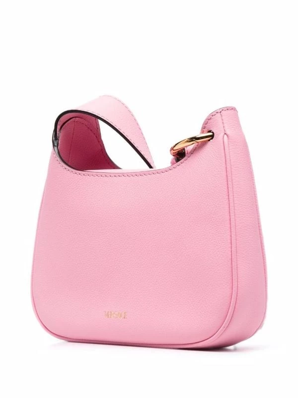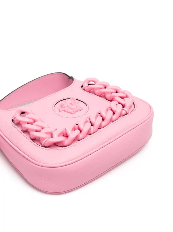 Détail Medusa, détail de chaîne oversize, logo embossé à l’arrière, ouverture sur le dessus, finitions en métal doré, bride porté épaule détachable et ajustable, poche intérieure plaquée. Couleur : rose. Matière : cuir.