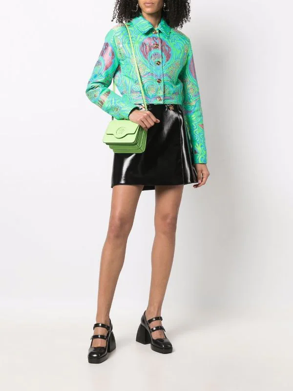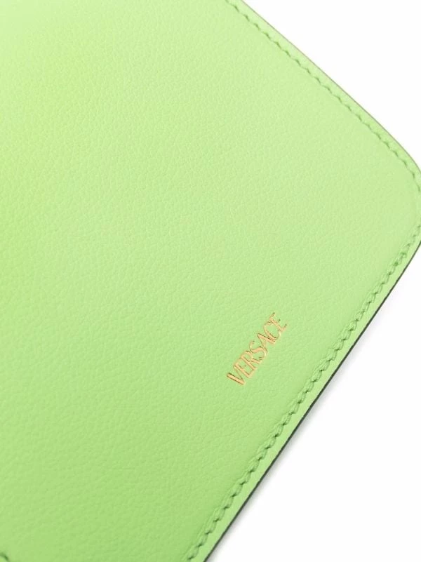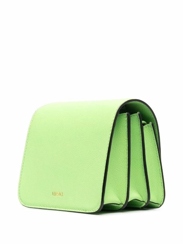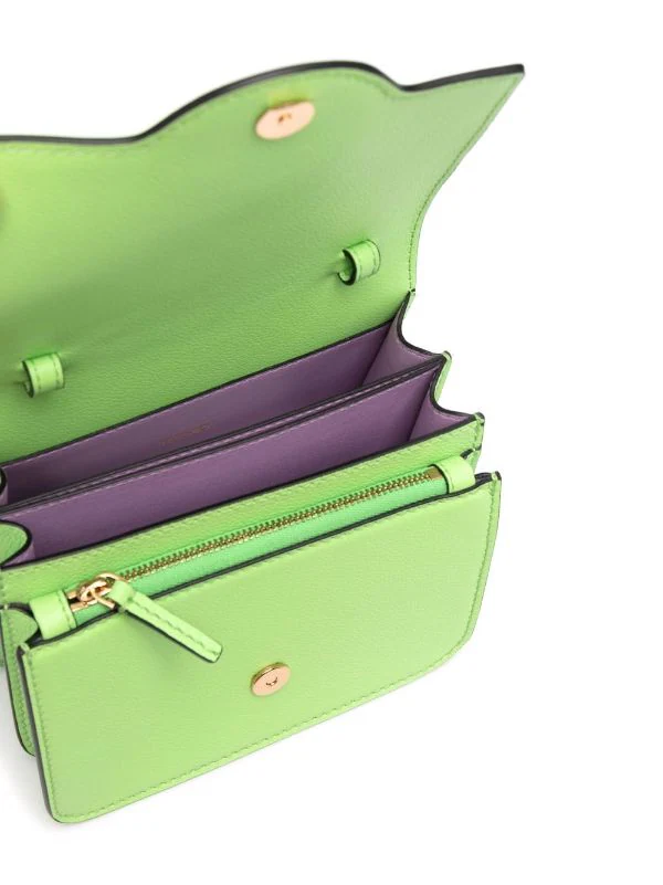Détail Medusa, rabat sur le dessus à fermeture magnétique, compartiment principal, poche intérieure zippée, bride porté épaule ajustable. Couleur : vert. Matière : cuir.