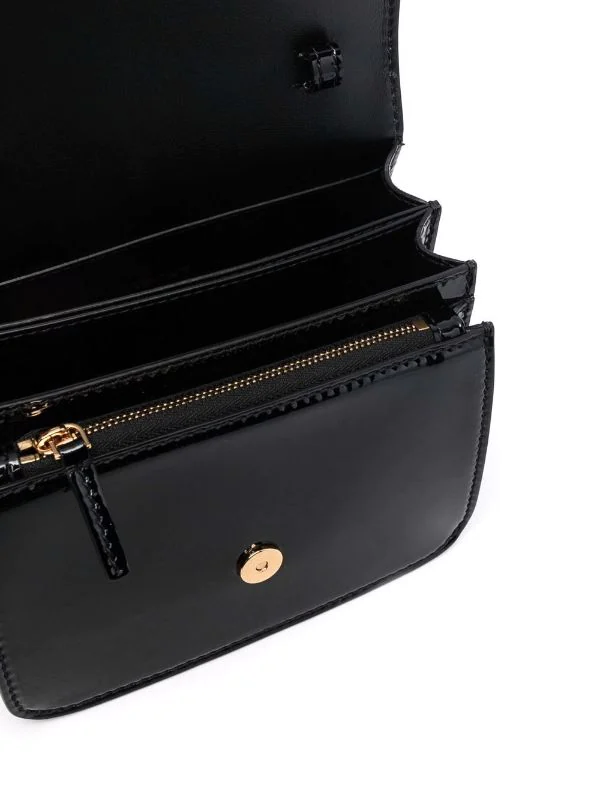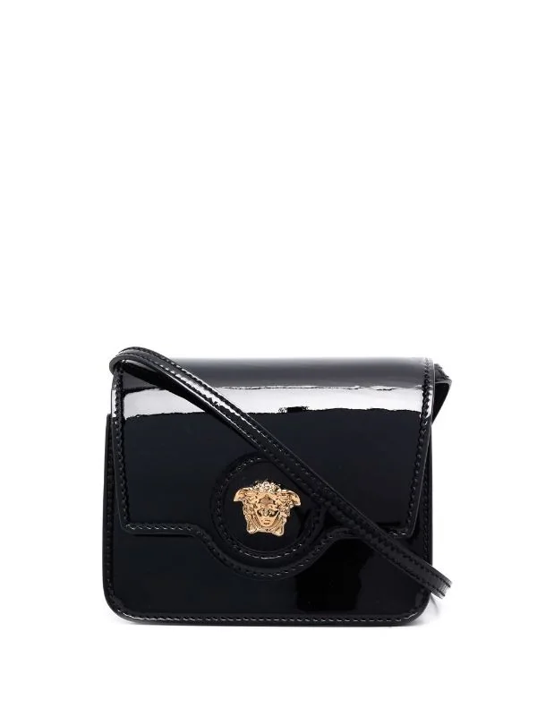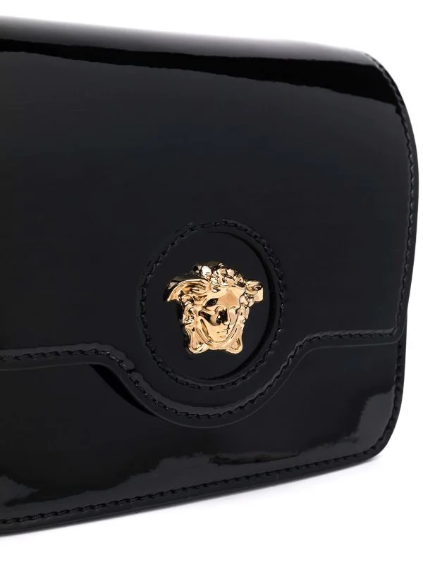 Motif Medusa, bride porté épaule ajustable, rabat sur le dessus à fermeture magnétique, compartiment intérieur, poche intérieure zippée. Couleur : noir. Matière : cuir de veau.