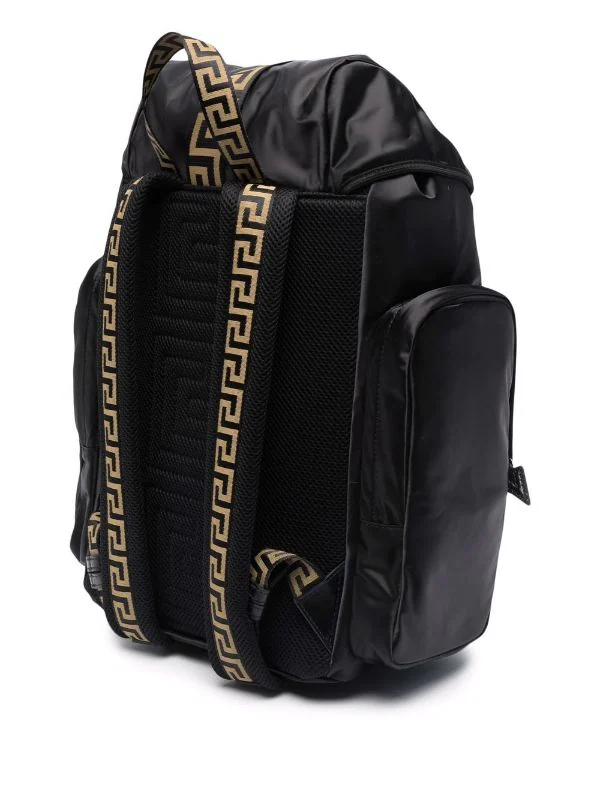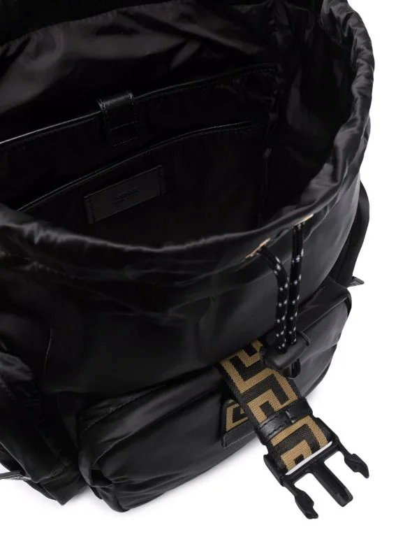Fini satiné, détail Greca signature, logo imprimé et orné, compartiment principal, patch logo intérieur, poche intérieure plaquée, compartiment zippé sur le devant, rabat sur le dessus, fermeture à boucle, anse classique, brides porté épaule ajustables. Matière : cuir de veau.