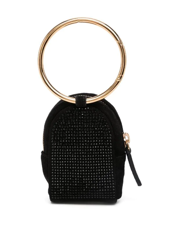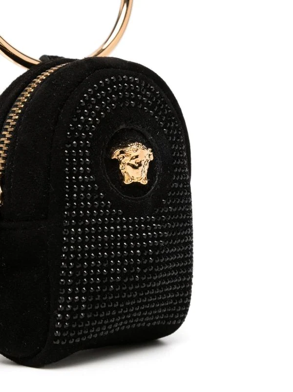 Noir, cuir, chèvre velours, finitions en métal doré, motif Medusa, ornement en cristal, fermeture zippée sur le dessus, compartiment principal, anse arrondie.