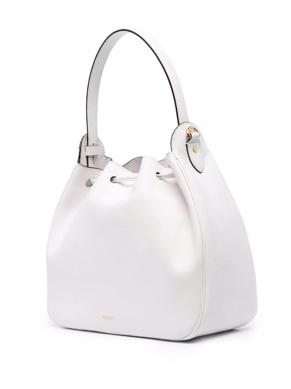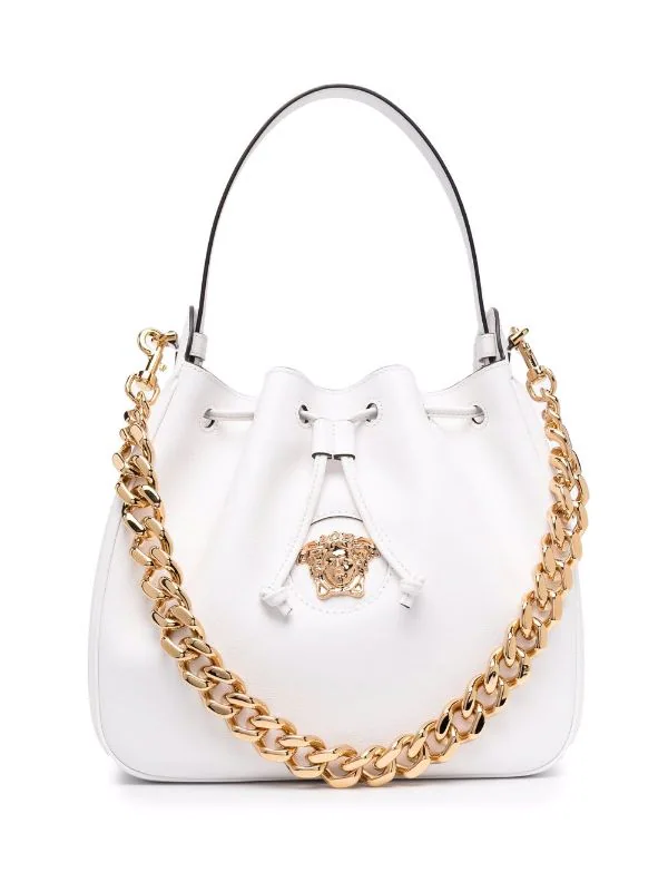 Détail Medusa, finitions en métal doré, étui à lien de resserrage, bride porté épaule en chaîne. Couleur : blanc. Matière : cuir.