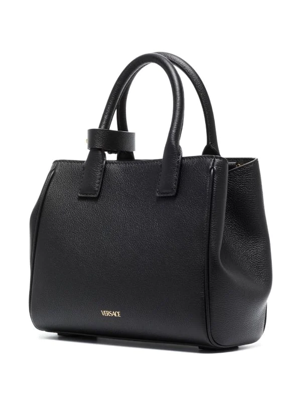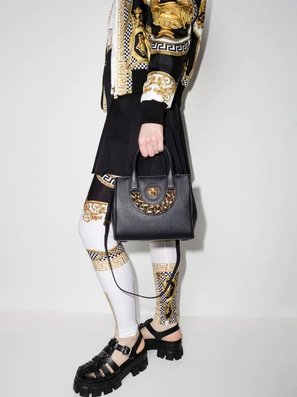 Motif Medusa, détails de chaînes, anses arrondies, bride porté épaule détachable et ajustable, poche intérieure zippée. Couleur : noir. Matière : cuir.