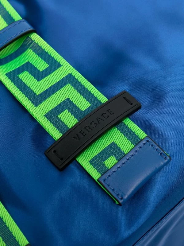 Bleu aqua, vert fluorescent, liseré en cuir, deux brides porté épaule ornées à logo, fermeture à boucle logo, fermeture zippée sur le dessus.