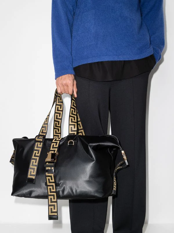 Détail Greca signature, fermeture zippée sur le dessus, compartiment principal, finitions à boucle décorative, anses arrondies. Couleur : noir.