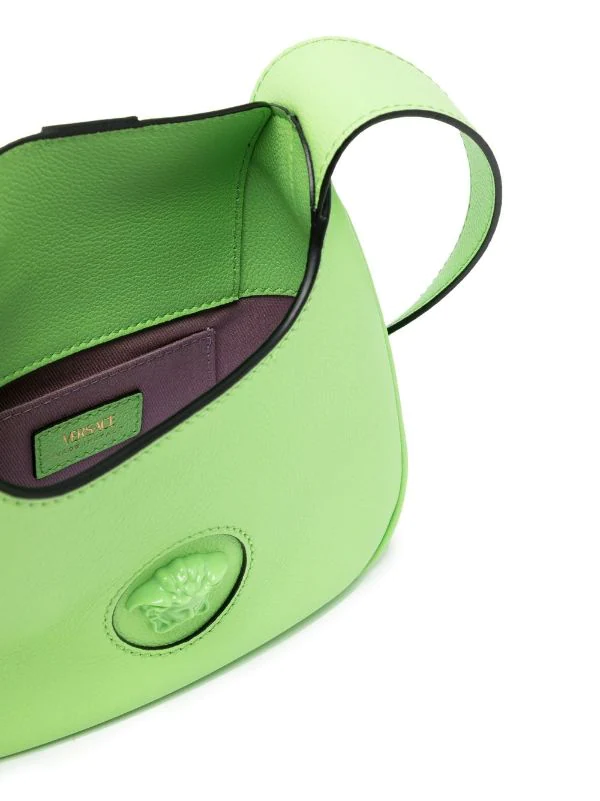 Vert fluorescent, cuir de veau, motif Medusa, rabat sur le dessus, compartiment principal, poche intérieure plaquée, bride porté épaule ajustable.