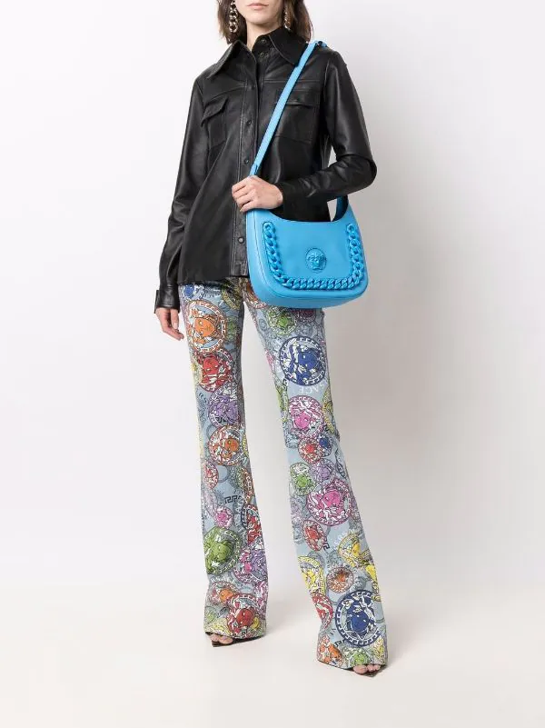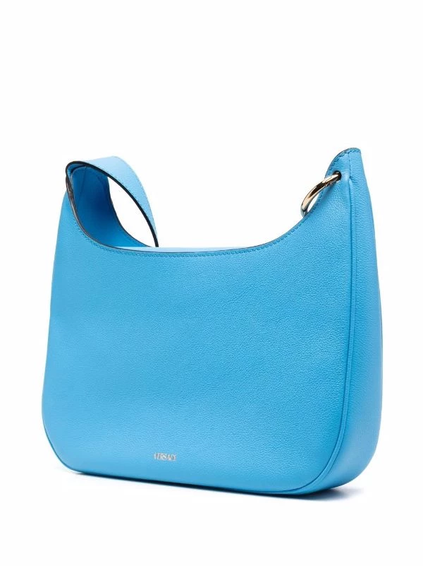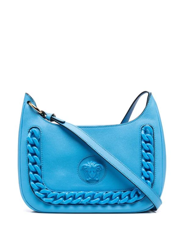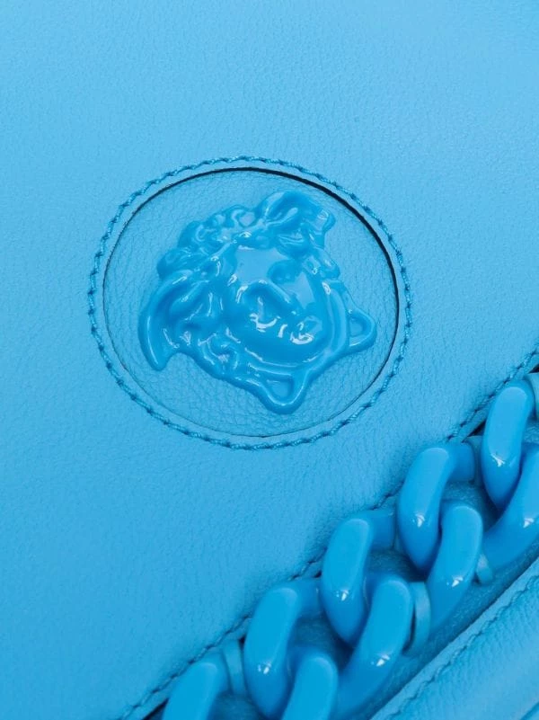 Bride porté épaule ajustable, détail Medusa, détails de chaînes, compartiment principal, poche intérieure zippée, rabat sur le dessus, design ton sur ton, texture grainée. Couleur : bleu. Matière : cuir de veau.