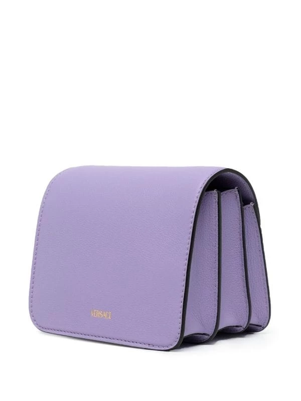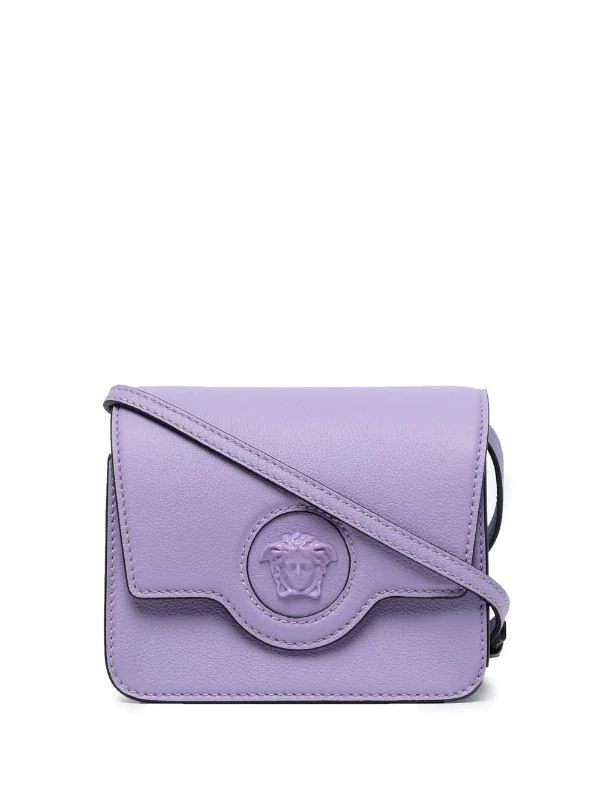 Violet, cuir de veau, motif Medusa, rabat sur le dessus à fermeture magnétique, compartiment intérieur, poches intérieures zippées, bride porté épaule détachable et ajustable.