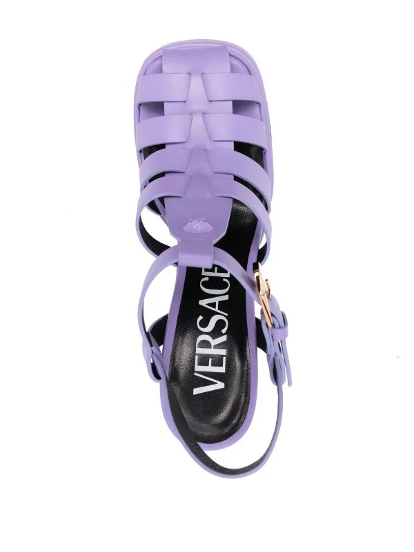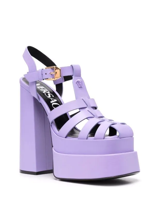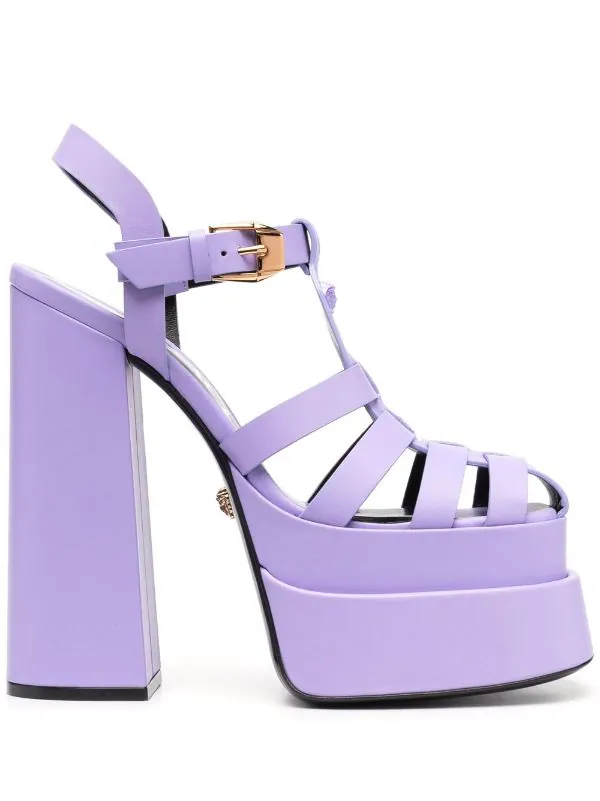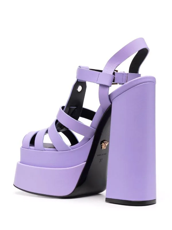 Semelle intérieure à logo, bout ouvert, fermeture à boucles sur les côtés, talon haut épais, finitions en métal doré. Matière : cuir.