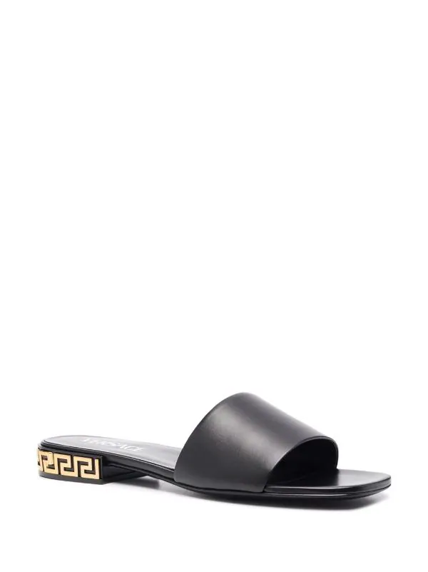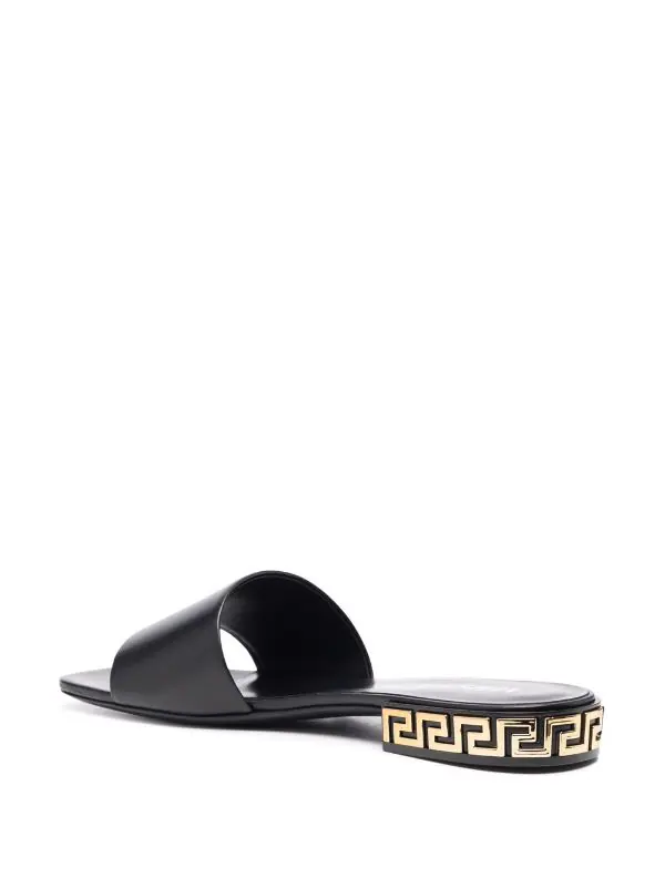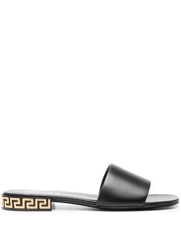 Petit talon épais, détail Greca signature, design à enfiler, bout ouvert, semelle en cuir. Couleur : noir. Matière : cuir de veau.