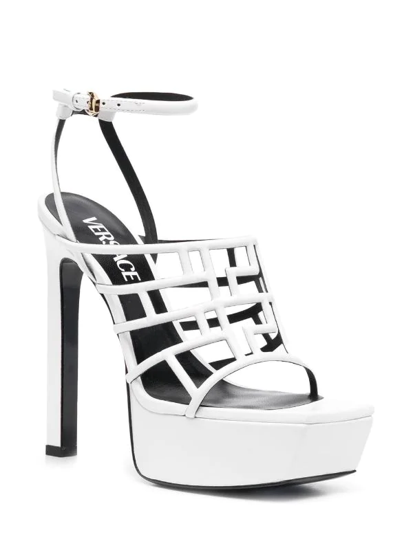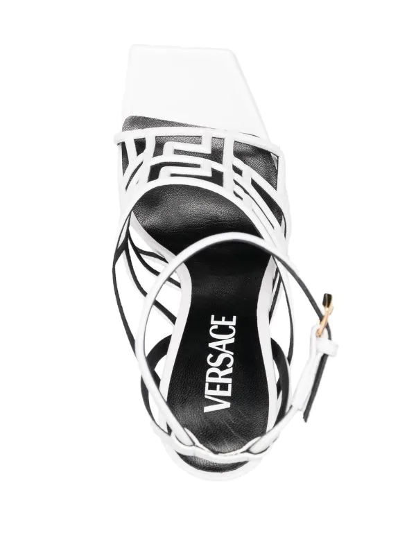 Conçues avec un design à brides, ces sandales Versace à semelle plateforme sont ornées d’un motif Greca découpé. La paire est confectionnée en cuir blanc avec un talon haut comme un ciel.