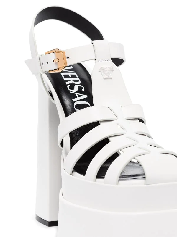 Semelle intérieure à logo, bout carré, lanière tressée, motif Medusa, bride cheville à boucle, talon haut épais, semelle à plateforme. Couleur : blanc. Matière : cuir.