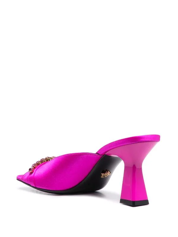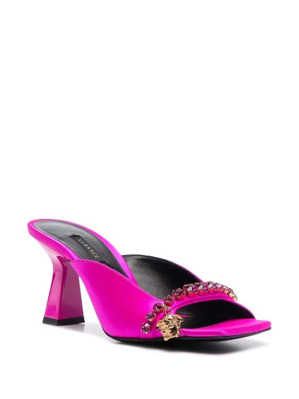 Fini satiné, détail Medusa, ornement en strass, bout ouvert, design à enfiler, semelle intérieure griffée, talon sculpté haut. Matière : cuir.