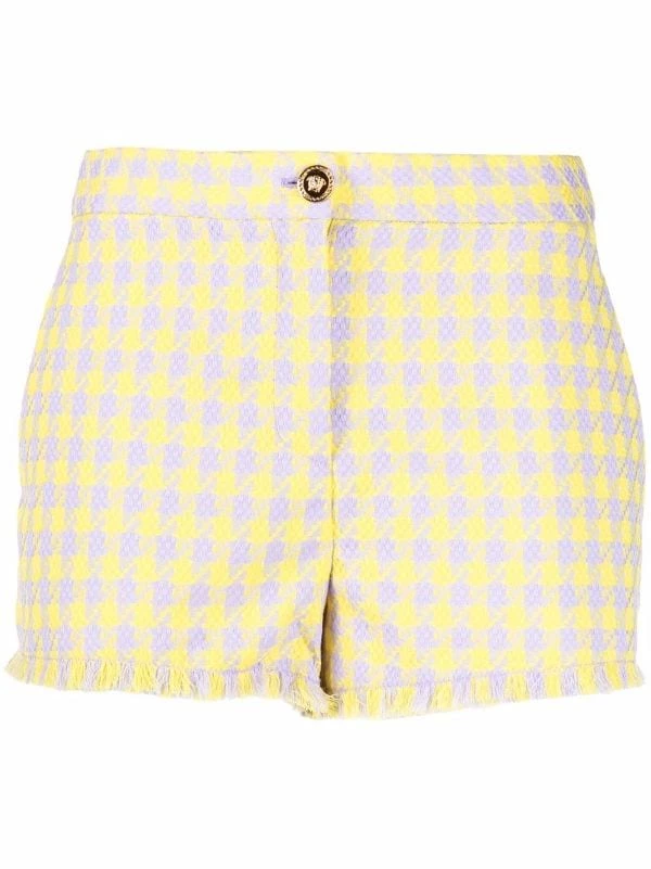 Imprimé pied-de-poule, fermeture à zip et boutons sur le devant, deux poches latérales fendues, bords frangés. Matière : laine vierge.