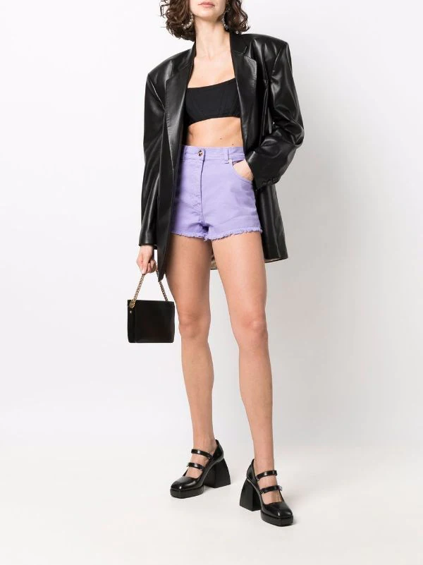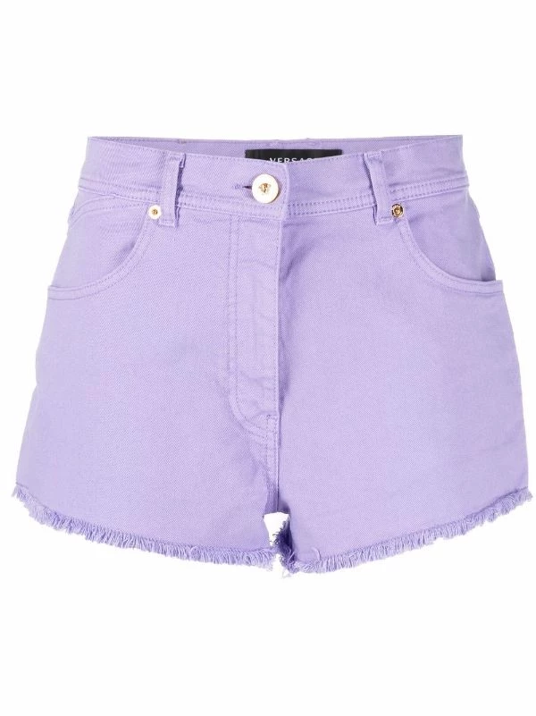Passants de ceinture, fermeture à zip et boutons sur le devant, poches latérales arrondies, poches arrière plaquées, patch logo sur l’arrière, bords frangés. Couleur : violet.