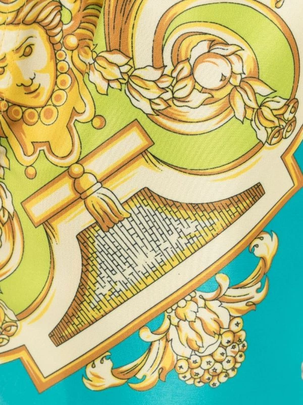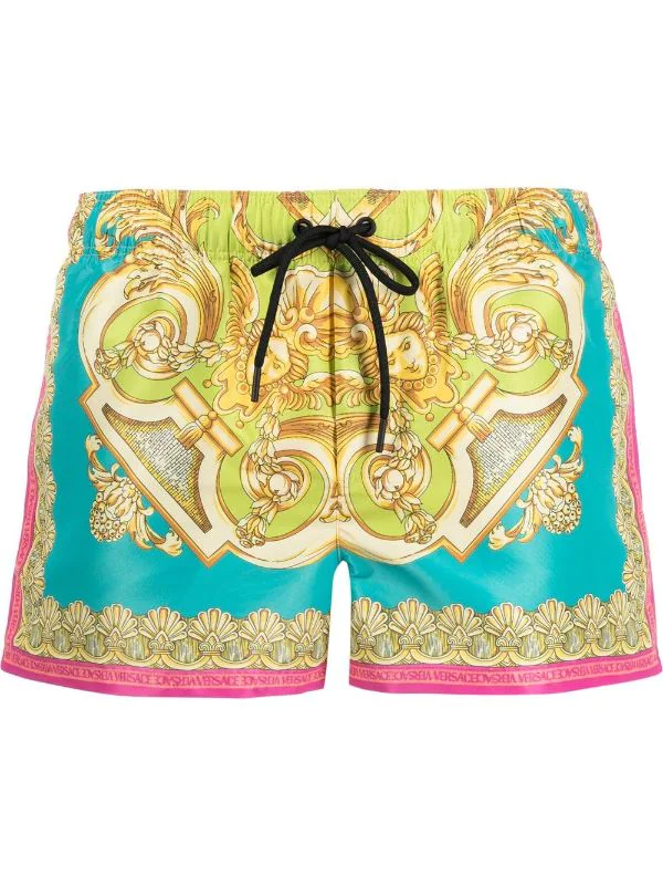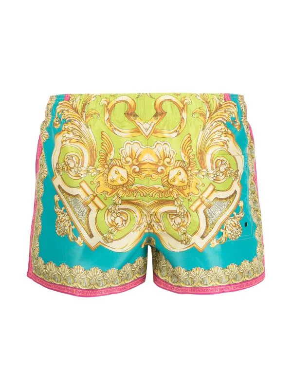 Motif baroque, ceinture élastique, lien de resserrage à la taille, coupe courte. Veillez à essayer les maillot de bain par-dessus vos propres sous-vêtements.