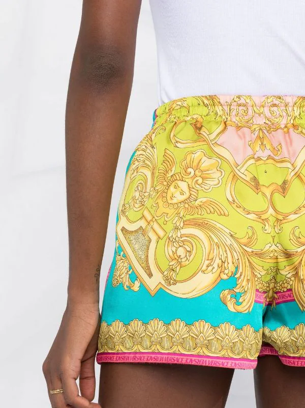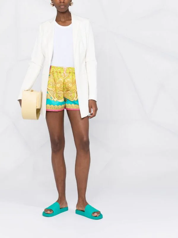 Motif baroque, ceinture élastique, design à enfiler, coupe courte.
