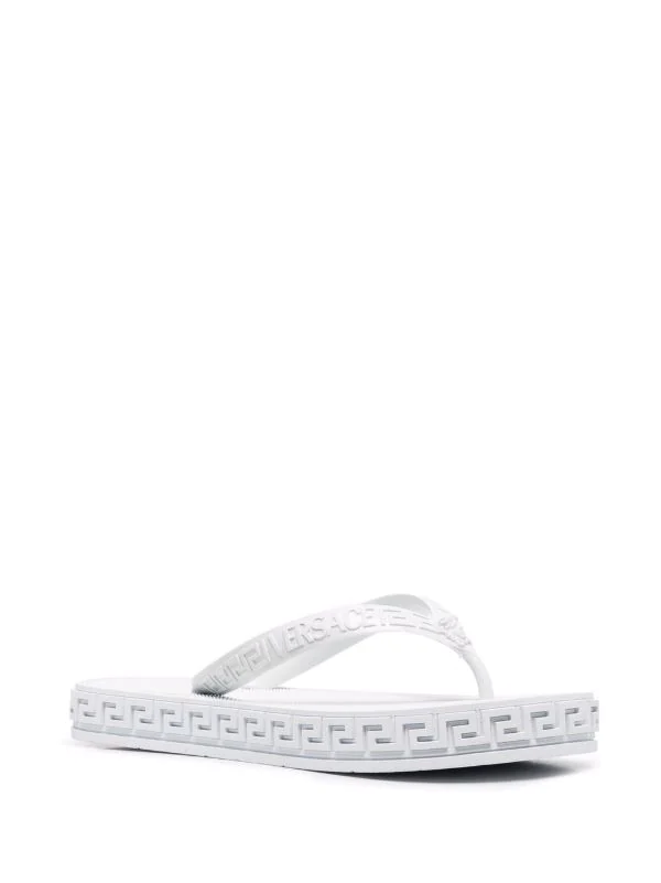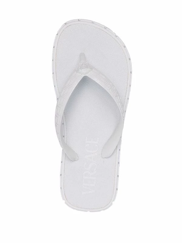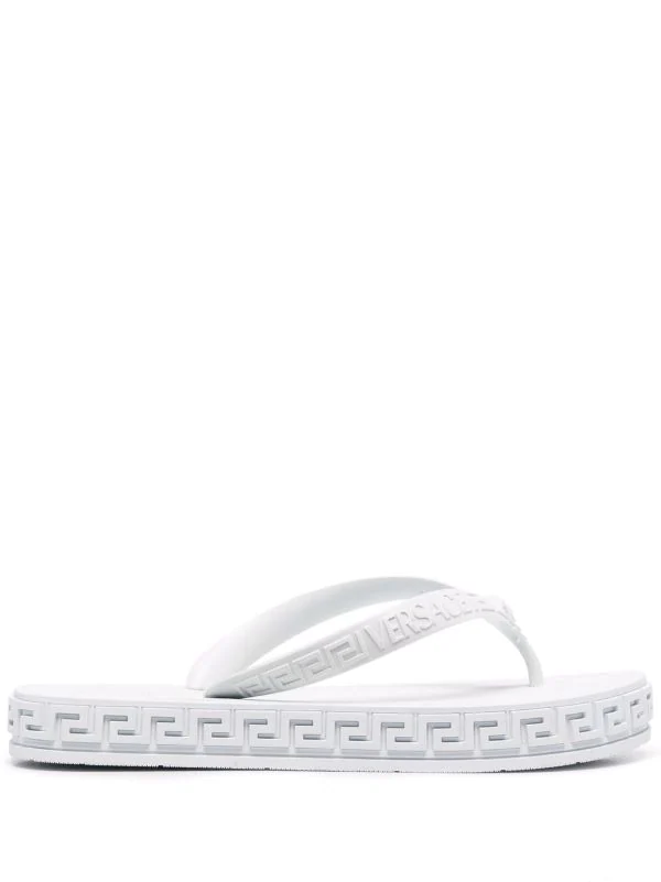 Détail Greca embossé signature, motif Medusa, entre-doigts, bout ouvert, design à enfiler, semelle plate en caoutchouc. Couleur : blanc.