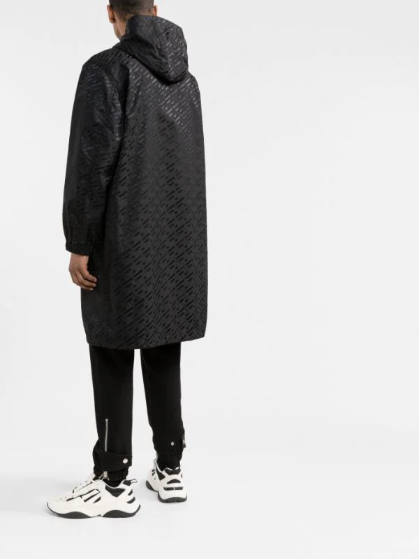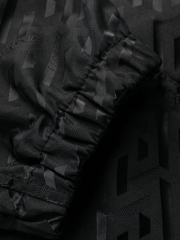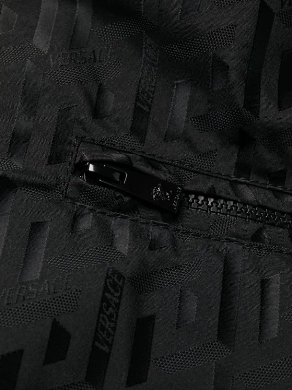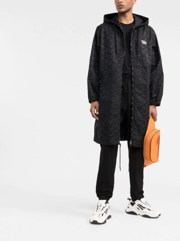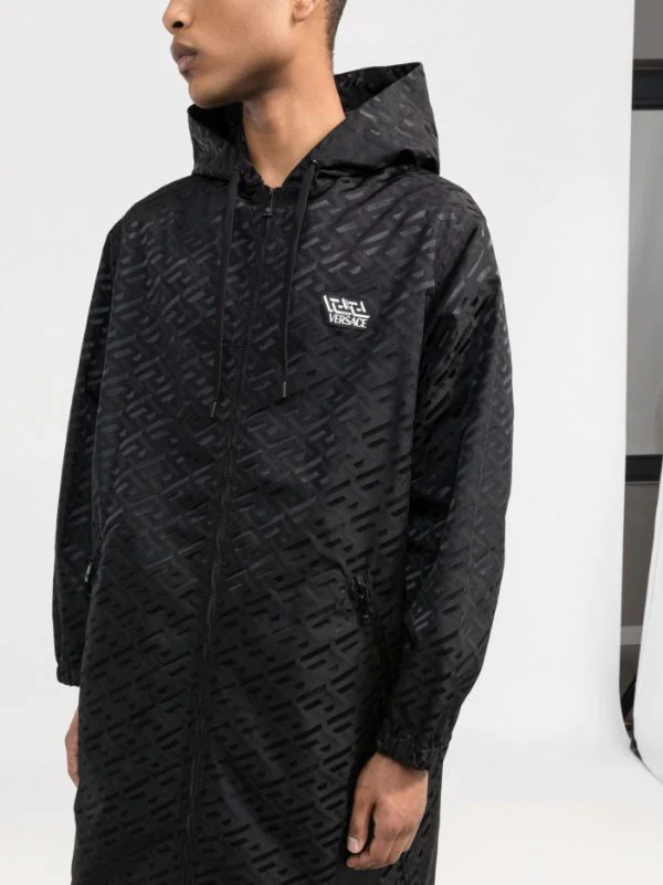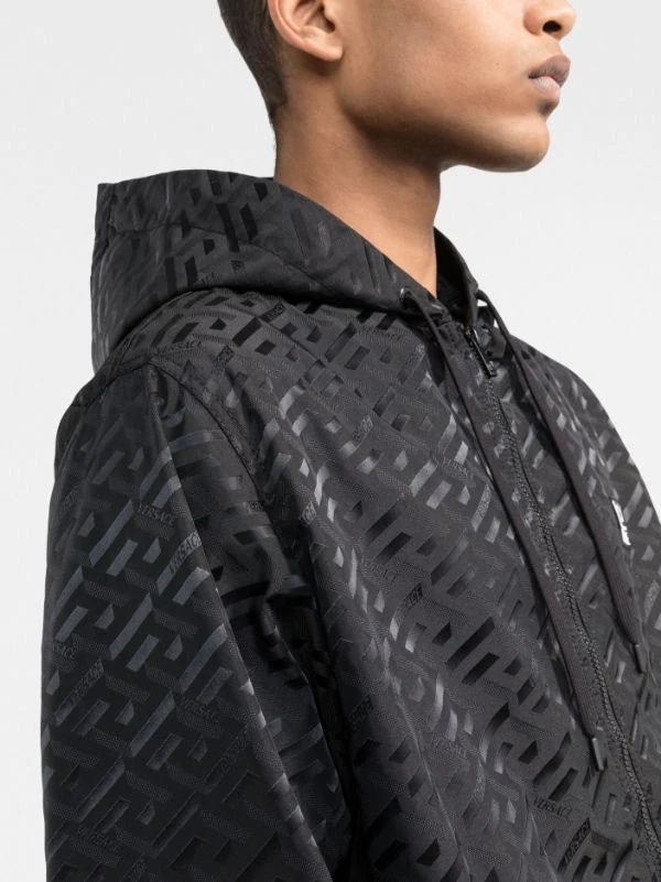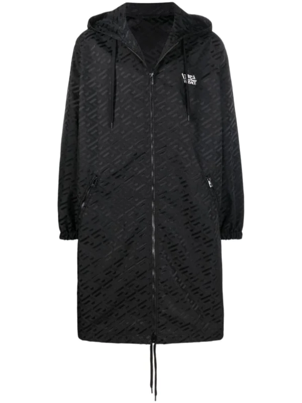 Imprimé La Greca signature, imprimé monogrammé, patch poitrine à logo, capuche à lien de resserrage, fermeture zippée devant, manches longues, deux poches latérales zippées, coupe mi-longue.