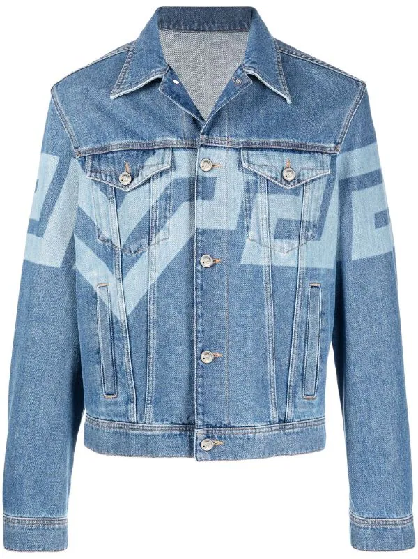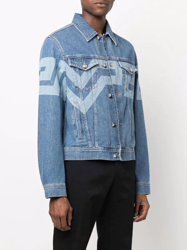 Motif Greca signature imprimé, boutons argentés à détails embossés, col classique, deux poches poitrine à rabat, boutonnière sur le devant, deux poches passepoilées latérales, tirants à boutons décoratifs, manches à poignets boutonnés. Couleur : bleu. Matière : coton.