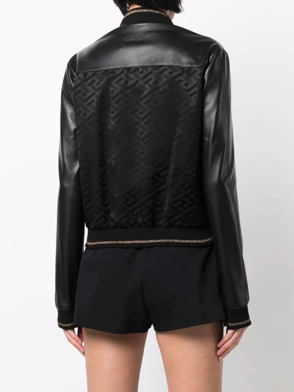 Col montant, manches longues, détail Greca signature, boutonnière sur le devant, poche latérale passepoilée. Couleur : noir.