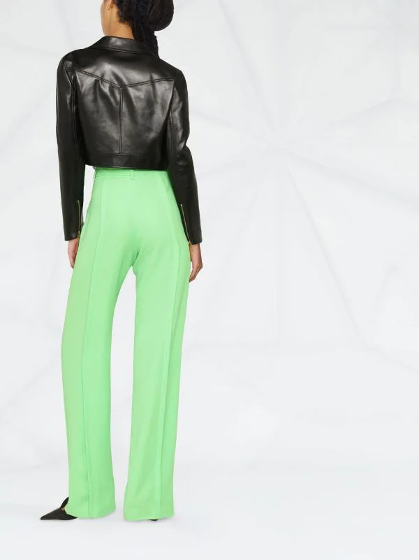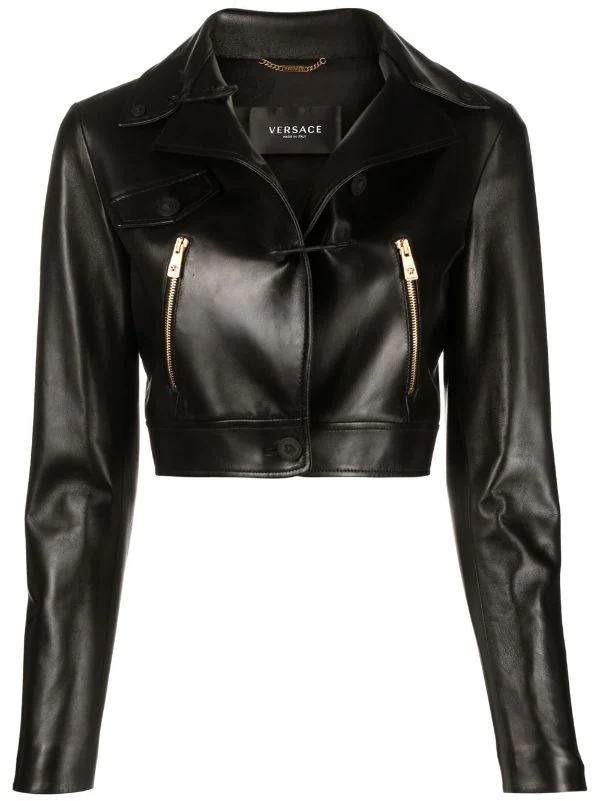 Détail d’épingle Medusa signature, coutures ton sur ton, finitions en métal doré, col classique, poche devant à rabat, deux poches latérales zippées, manches longues, poignets zippés, ourlet droit, doublure intégrale, coupe courte. Couleur : noir. Matière : peau d’agneau.