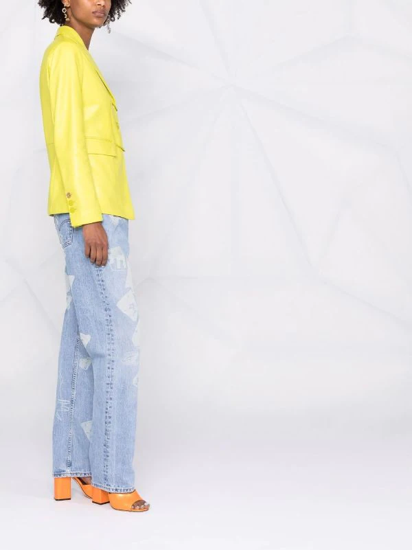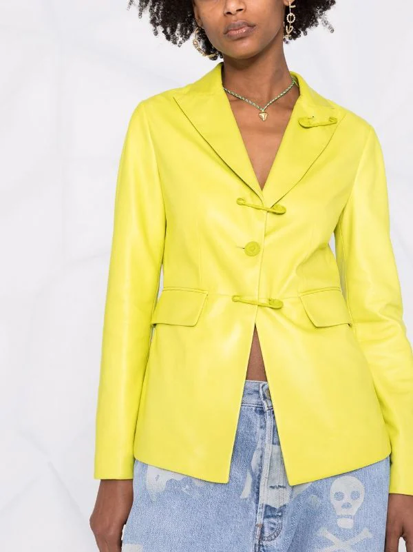 Détail d’épingle Medusa signature, revers crantés, boutonnière sur le devant, manches longues, poignets boutonnés, poches latérales à rabat.