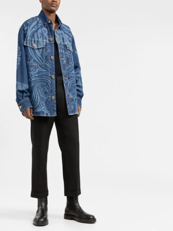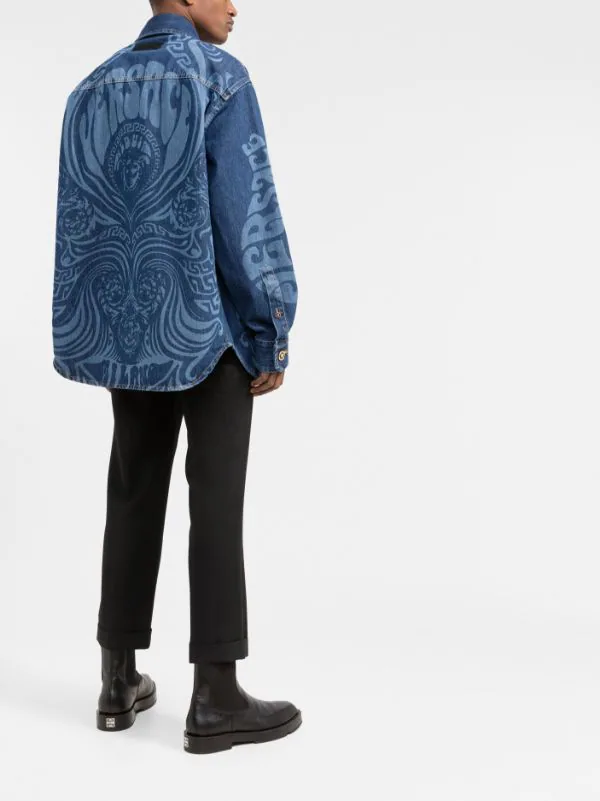 Imprimé monogrammé, col boutonné, manches longues, poignets boutonnés, deux poches poitrines boutonnées, boutonnière sur le devant. Couleur : bleu. Matière : coton.