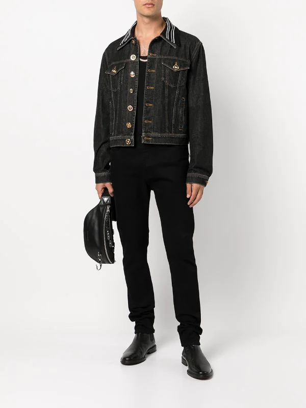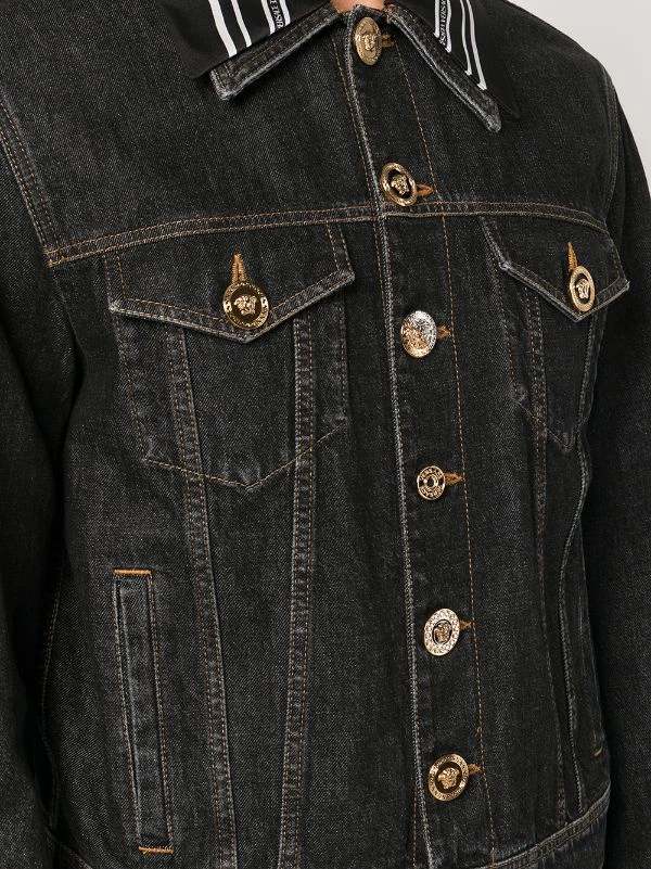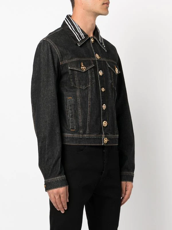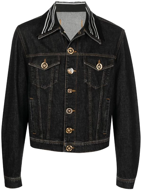 Bleu, coton mélangé, denim délavé, motif Medusa, coutures contrastantes, deux poches poitrine à rabat, boutonnière sur le devant, deux poches passepoilées latérales, poignets boutonnés.
