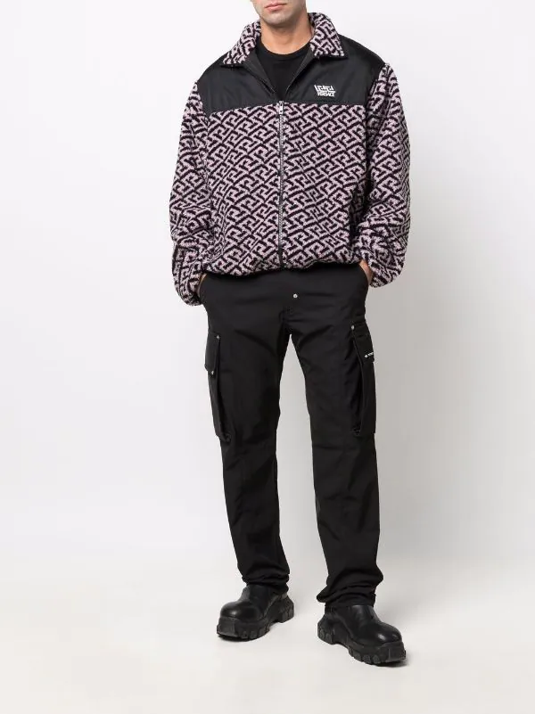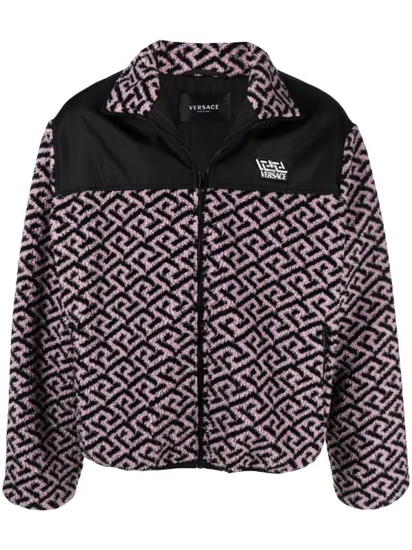 Texture polaire, imprimé graphique intégral, patch poitrine à logo, col montant, fermeture zippée devant, manches longues, deux poches latérales zippées.