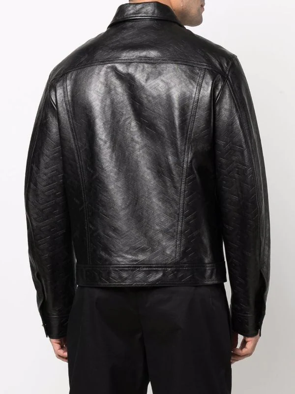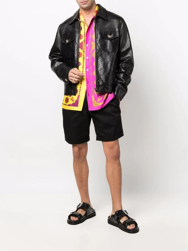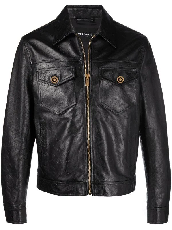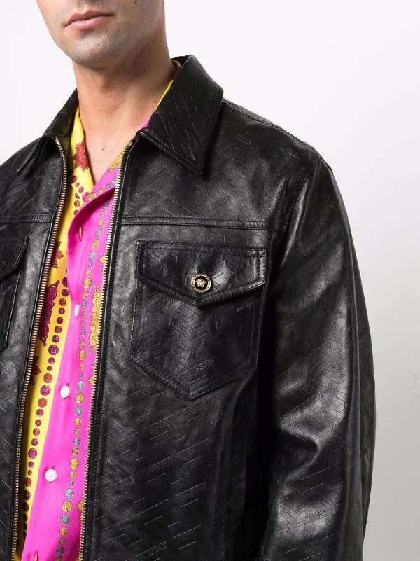 Imprimé La Greca signature, motif Medusa, col classique, poche zippée sur le devant, manches longues, poignets boutonnés, deux poches poitrine à rabat, deux poches latérales fendues, ourlet droit. Couleur : noir.