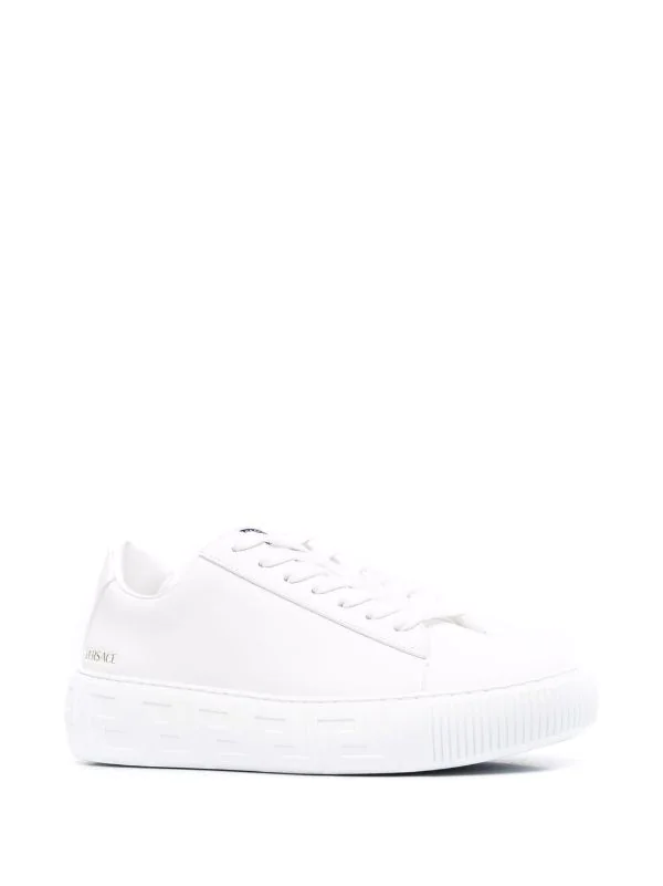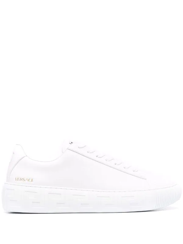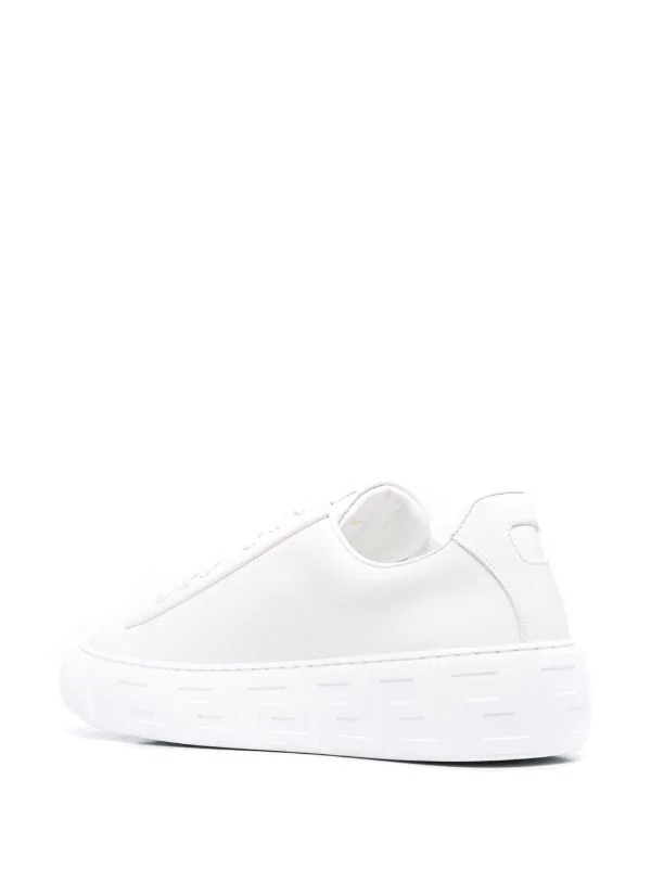 Bout rond, languette à patch logo, semelle intérieure à logo, fermeture à lacer sur le devant, détail Greca signature, logo imprimé sur le côté, semelle plate en caoutchouc. Couleur : blanc. Matière : cuir.