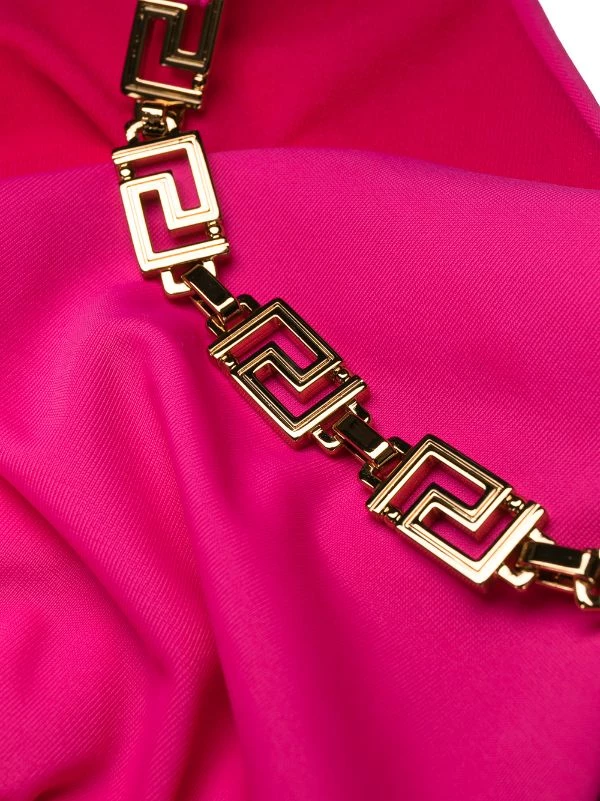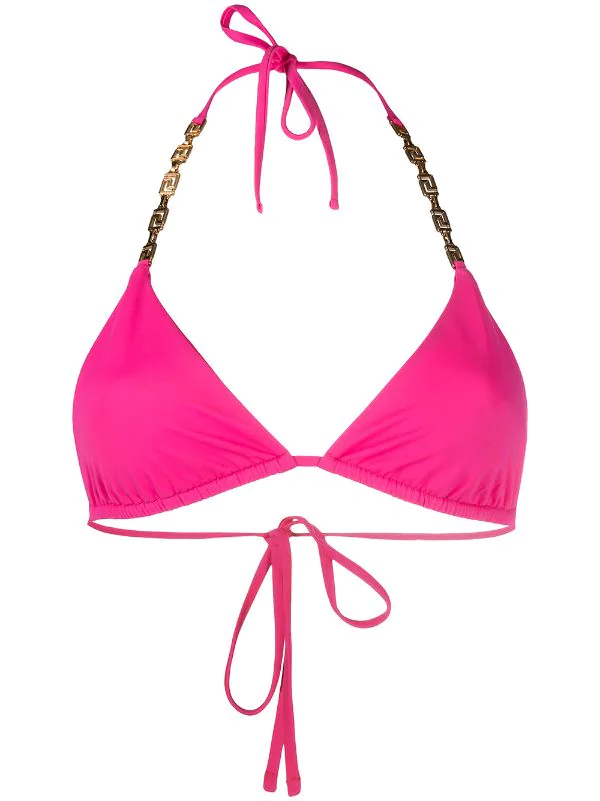 Détail Greca signature, bonnets triangles, dos-nu, fermeture nouée au dos. Couleur : Rose. Veillez à essayer les maillot de bain par-dessus vos propres sous-vêtements.
