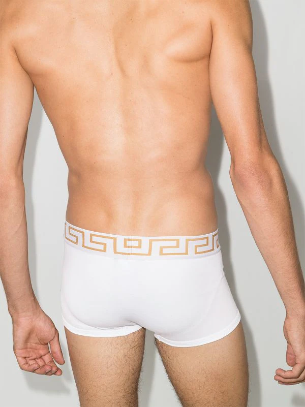Boxer White Greca Versace avec silhouette ajustée et coupe courte. Couleur : blanc. Les sous-vêtements et la lingerie doivent être essayés par dessus vos propres vêtements.