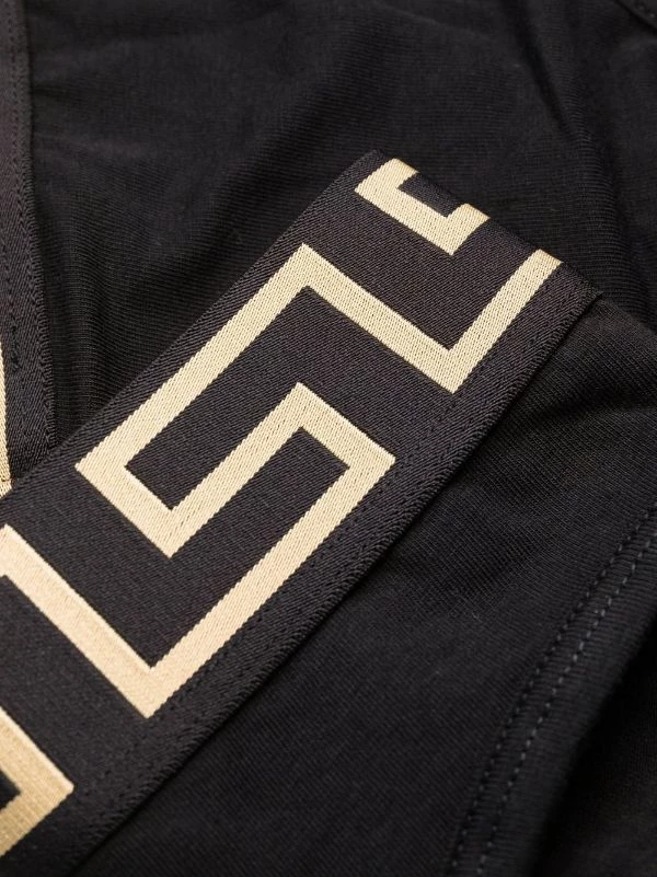 Détail Greca signature, ceinture élastique, construction stretch. N’oubliez pas : cet article doit être essayé par-dessus vos propres vêtements.