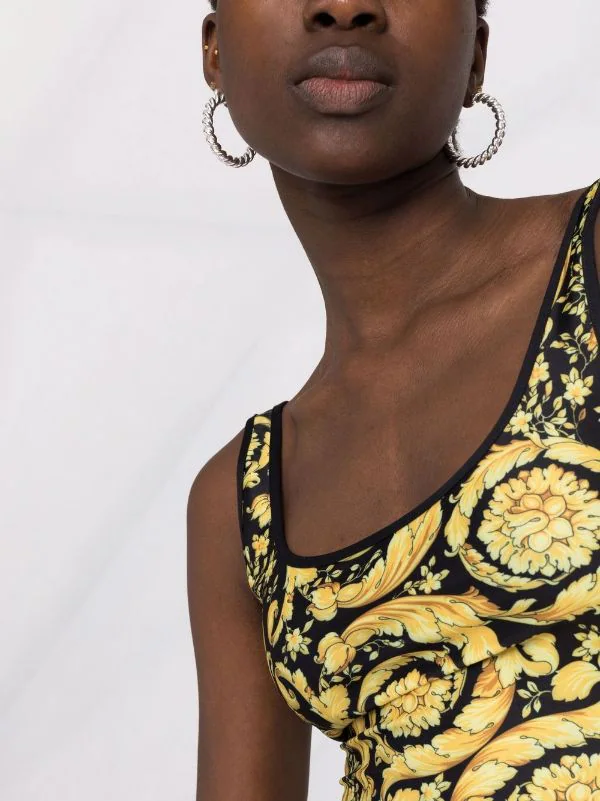 Motif baroque, encolure arrondie, décolleté arrondi dans le dos, coupe courte. Couleur : noir. Veillez à essayer les maillot de bain par-dessus vos propres sous-vêtements.