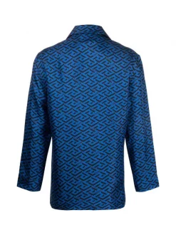 ( Nouvelle Collection ) Versace Haut De Pyjama En Soie à Imprimé Géométrique 5U290 SAPPHIRE BLACK
