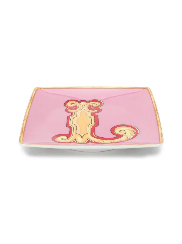 Assiestte Holiday Alphabet ‘L’ Versace Home avec forme carrée, dessus concave et imprimé baroque. Couleur : rose.